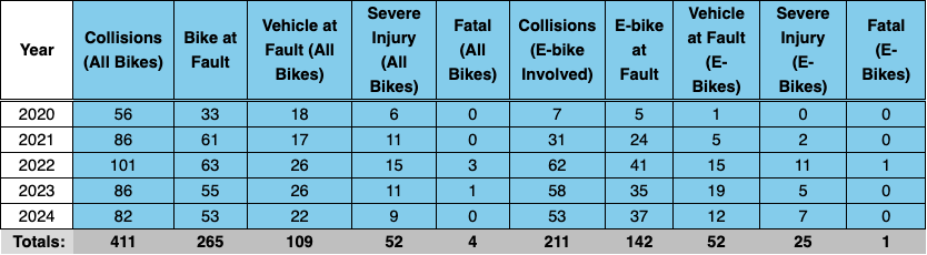 According to city data between 2020-24, there have been 411 total bike collisions, with a high of 101 in 2022. Riders were found to be at fault in 265 cases (64%), while vehicles were at fault in 109 (26.5%). Those incidents accounted for 52 severe injuries and four fatalities.