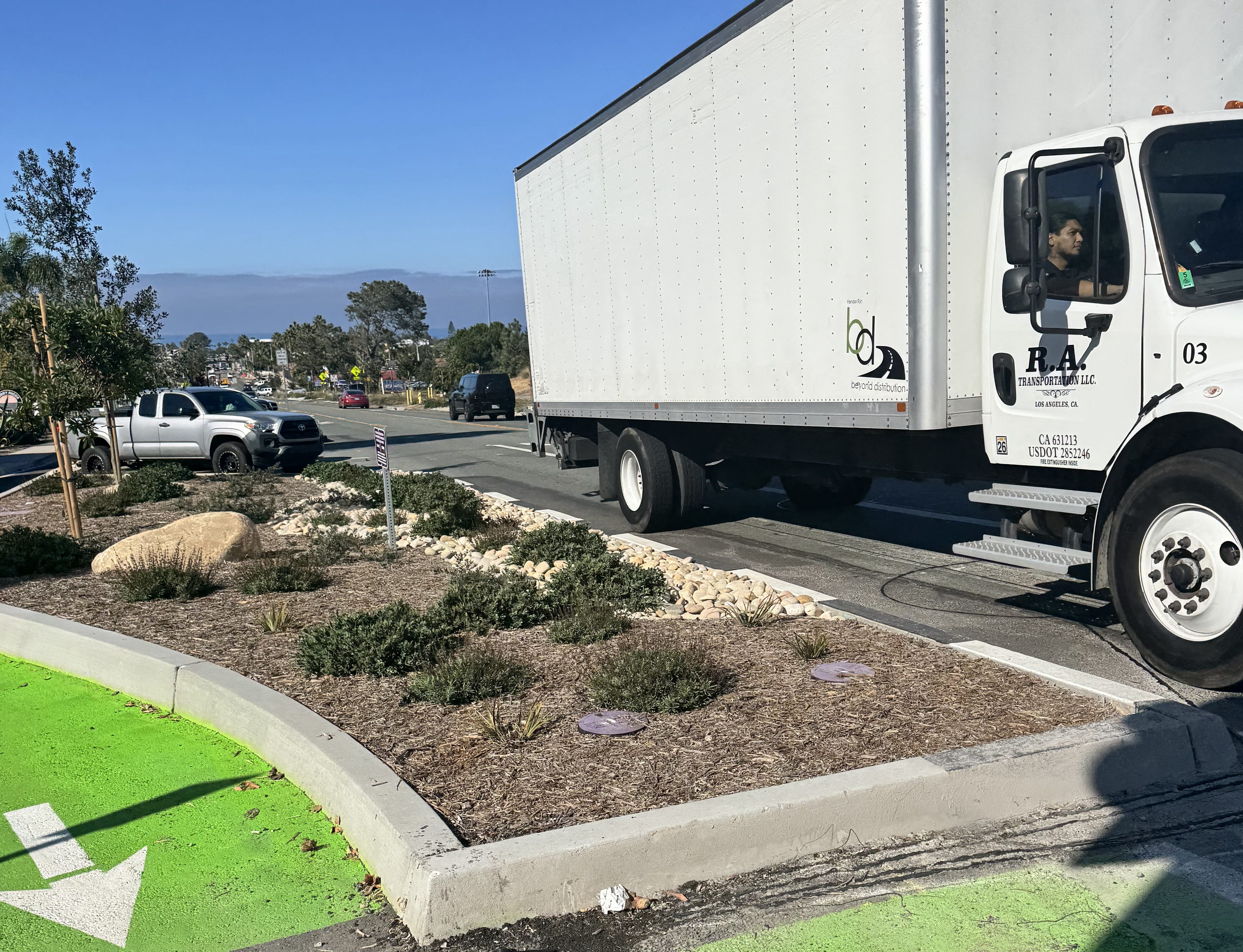 On the north side of the road along SDA’s campus, the layout features an 8.5-foot parallel parking lane adjacent to the curb, followed by a 2.5-foot painted buffer and a 6.5-foot bike lane and minimizes the S-curve at the Nardo/Mackinnon intersection. A secondary 3-foot buffer separates the bike lane from the 11-foot travel lane. A landscaped “parkway” sits between the sidewalk and parking so those drivers can access the sidewalk when leaving their vehicles.