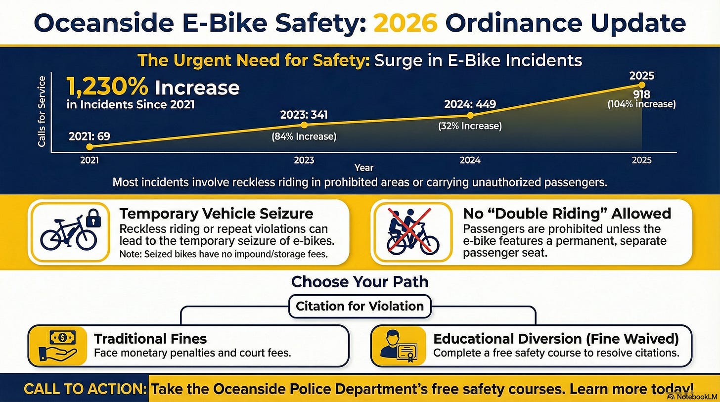 OCEANSIDE — Oceanside will allow police to seize e-bikes and ban double riding under new safety laws aimed at curbing reckless riding after calls for service surged nearly 1,200% since 2021.