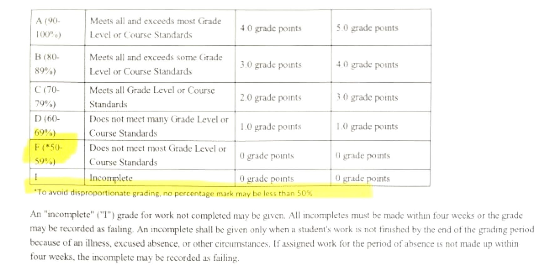 “To avoid disproportionate grading, no percentage mark may be less than 50%,” one of the documents read regarding scoring an incomplete assignment. “If assigned work for the period of absence is not made up within four weeks, the incomplete may be recorded as failing (and reverts to a 50%).”