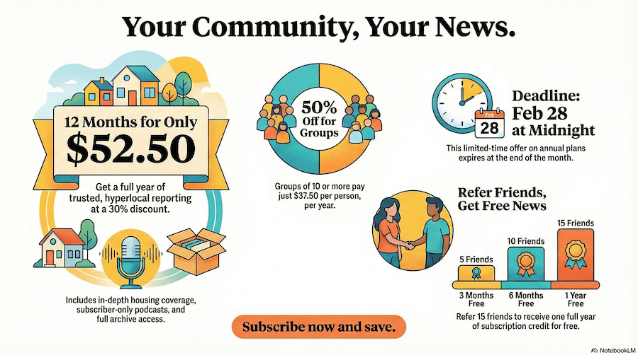 Take advantage of North County Pipeline’s limited-time offer. From now through Feb. 28 at midnight, you can receive 30% off an annual subscription — just $52.50 for 12 months of trusted, hyperlocal reporting.